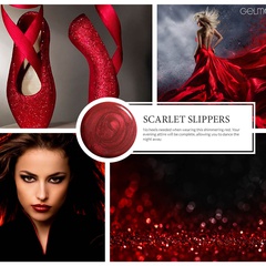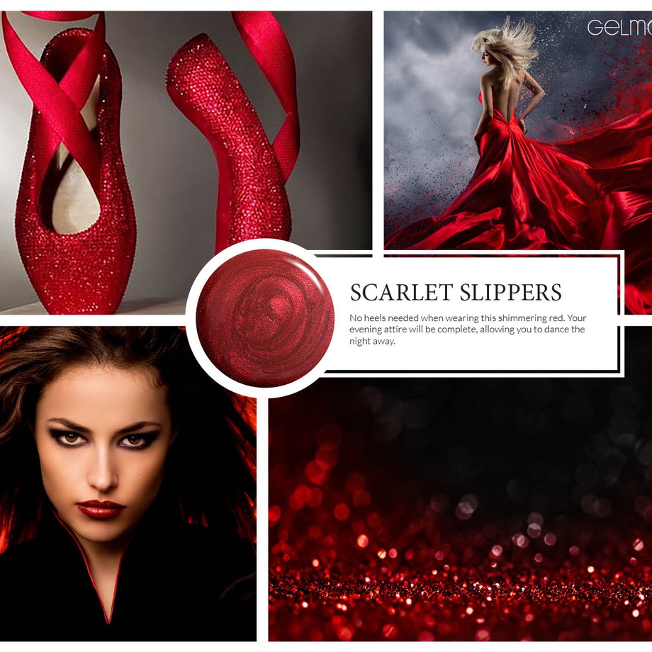 Scarlet red. Deep. Pearl finish. Opaque. Warm undertone.